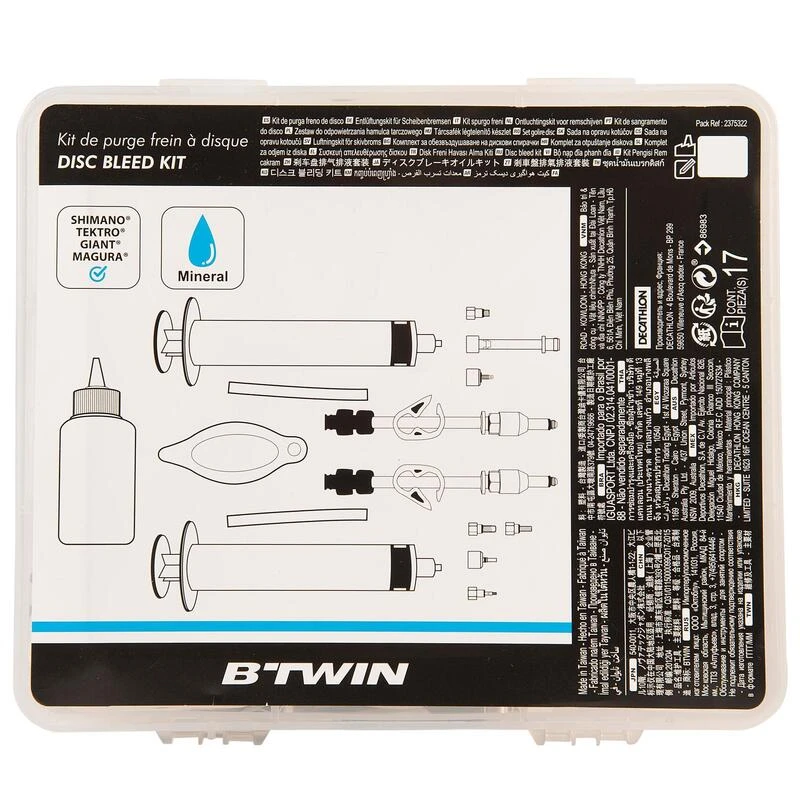 Conçu pour entretenir, purger la majorité des freins à disque en huile minérale du marché. Ne convient pas pour les freins à disque en DOT.Kit purge pour les freins à disque hydraulique en huile minérale de marque Shimano®, Magura®, Tektro®, et Giant®. Ce kit permet d’entretenir vos freins afin de prolonger leur performance.